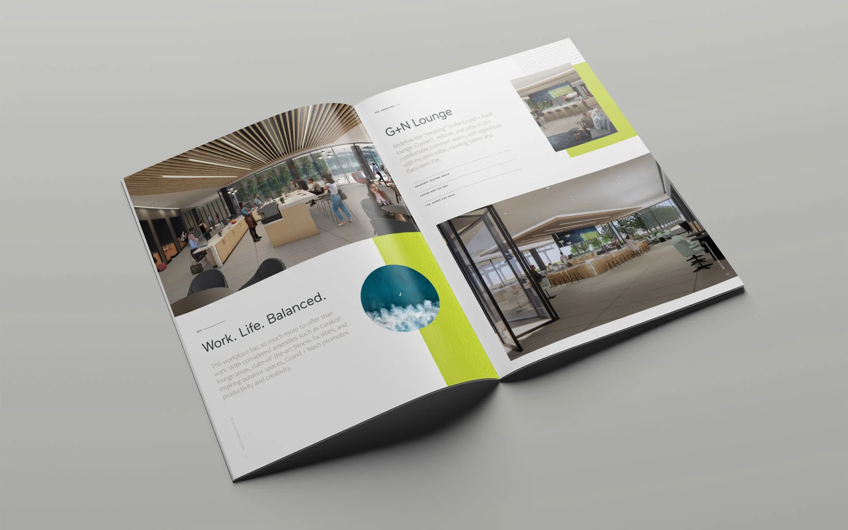 Haus created a modern design system for Grand + Nash that embodies the rich blend of natural and manmade textures found throughout the building itself. The logo features a simple monogram that represents the streets joining at the campus location. Through typography, color and pattern, we placed an emphasis on movement and growth, drawing parallels between the dynamics of the abundant foliage and modern architecture.